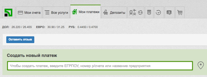 Итак, в ответ на приглашение системы, введя свой номер телефона и пароль, Вы входите в онлайн приложение Приватбанка. В верхней строке меню, выбираем пункт "Мои платежи"